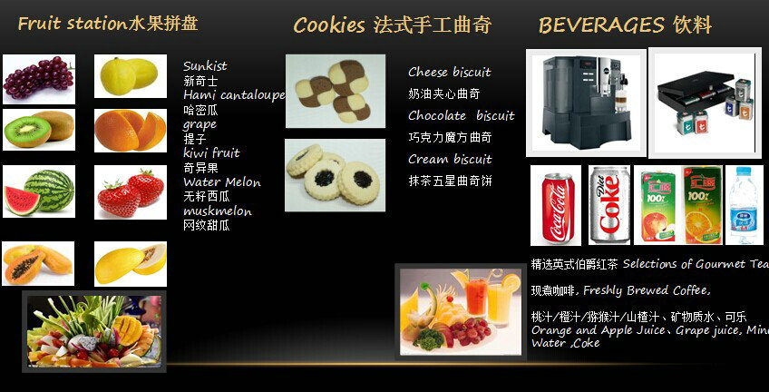 1.头盘及沙拉 2.各式小面包 3.西式热菜 4.甜点 5.水果 6.饮料